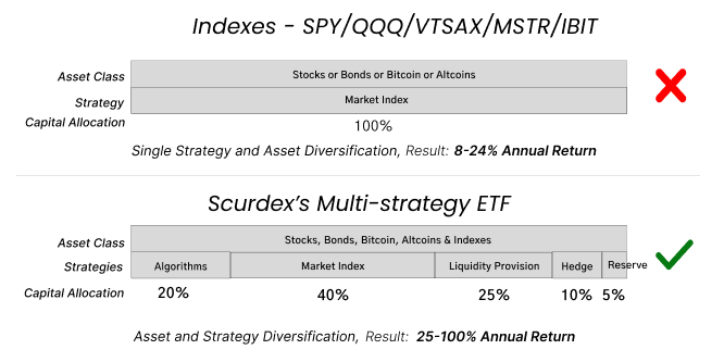 Our Decentralized ETF (SDC ETF) is the first blockchain-native, multi-strategy ETF combining algorithmic, hedged, and market index strategies—designed for retail and institutional investors and can be held in any digital wallet, including non-custodial options. Unlike traditional multi-asset ETFs, our multi-strategy approach ensures consistent, risk-adjusted returns.